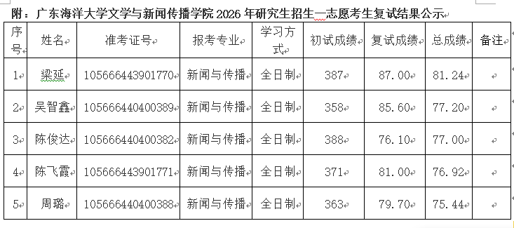 根据学校及我院研究生招生工作的相关文件精神和要求,经学院研究生招生录取工作领导小组审定,将我院2026年硕士研究生第一志愿考生复试结果按照最终得分进行排名,现予以公示。