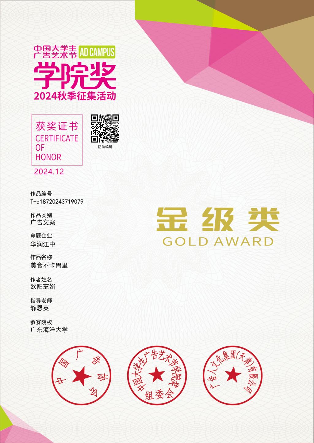 2024年中国大学生广告艺术节(学院奖)秋季赛于2024年12月26日、27日在北京广播大厦举行颁奖典礼和全场大奖赛(全部参赛作品的第一名)。william威廉中文新闻与传播系学生斩获佳绩:获金奖1项,优秀奖18项,入围奖14项。金奖得主欧阳芝娟同学受邀参加全场大奖角逐。指导教师静恩英受邀担任全场大奖赛现场评委,并获杰出指导教师奖。