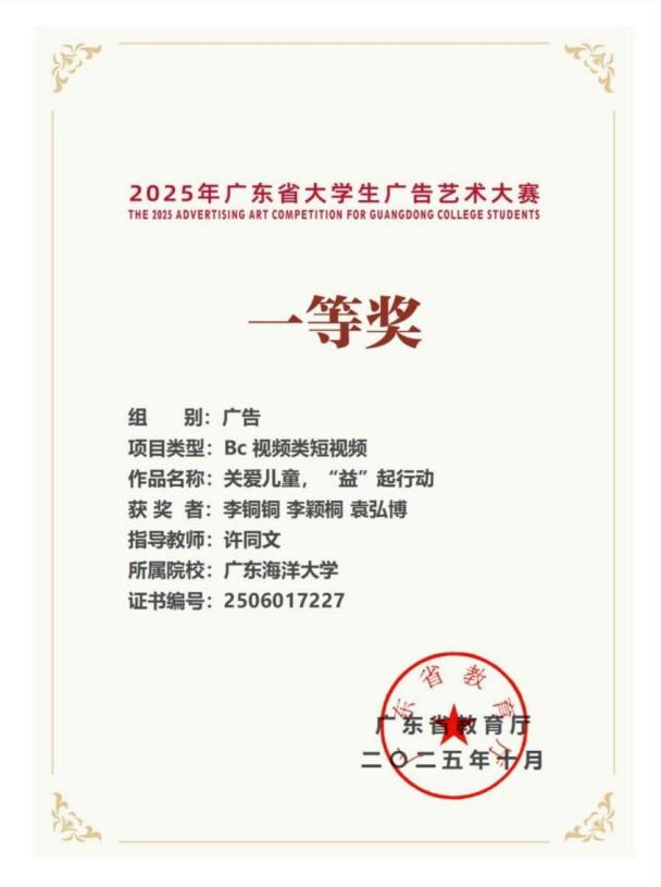 11月22日,第17届全国大学生广告艺术大赛(以下简称大广赛)广东赛区颁奖总结交流活动在广州商学院举行。文传学院共获一等奖1项、二等奖1项、三等奖2项。其中,李铜铜、李颖桐、袁弘博的作品《关爱儿童,“益”起行动》荣获省级一等奖、国家级二等奖。许同文老师被广东省教育厅评为“优秀指导教师”。