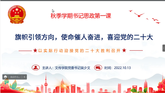 10月13日晚,文传学院党委书记吴少文、院长孙长军通过线上教学方式为学院团委学生会干部、学生党员和党员发展对象等240余人讲授新学期“思政第一课”。